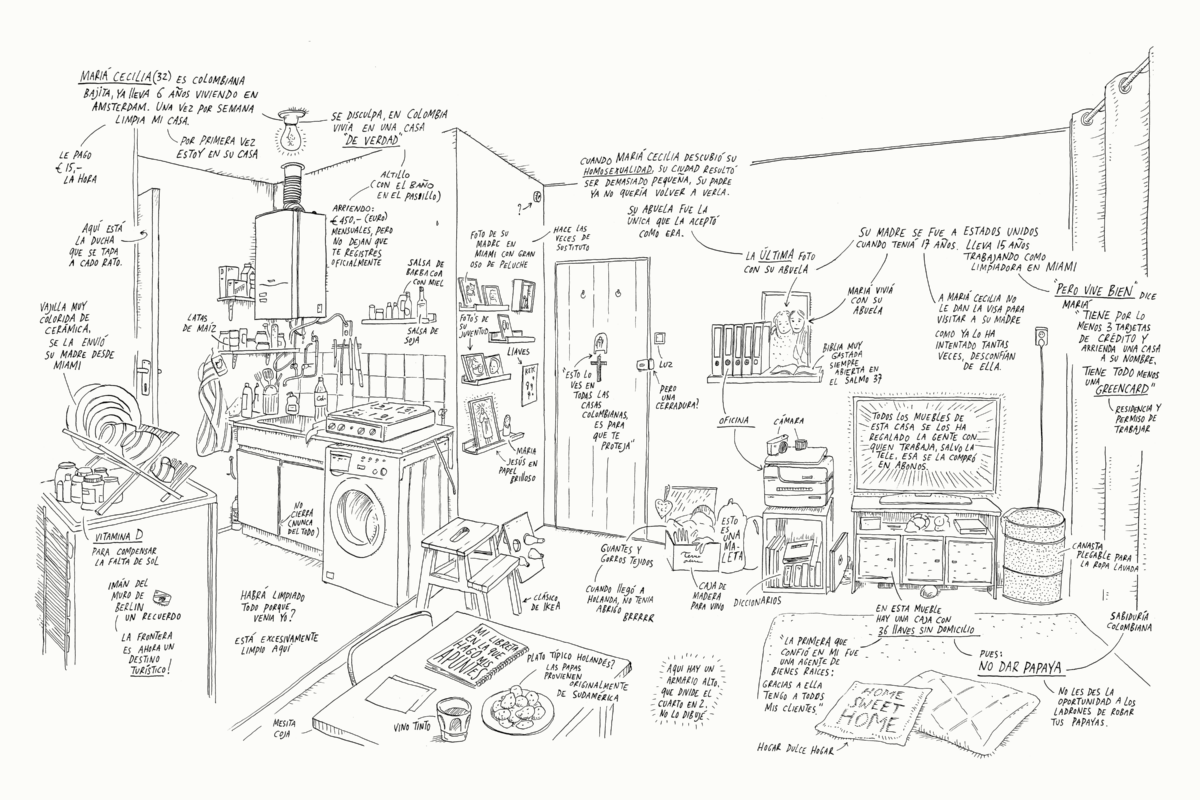 This is a drawing of the house of my cleaning lady. The Netherlands has an army of domestic helpers. Many of them do undeclared work. How many, nobody knows. They do not have labor rights. They are dependent of their employers.