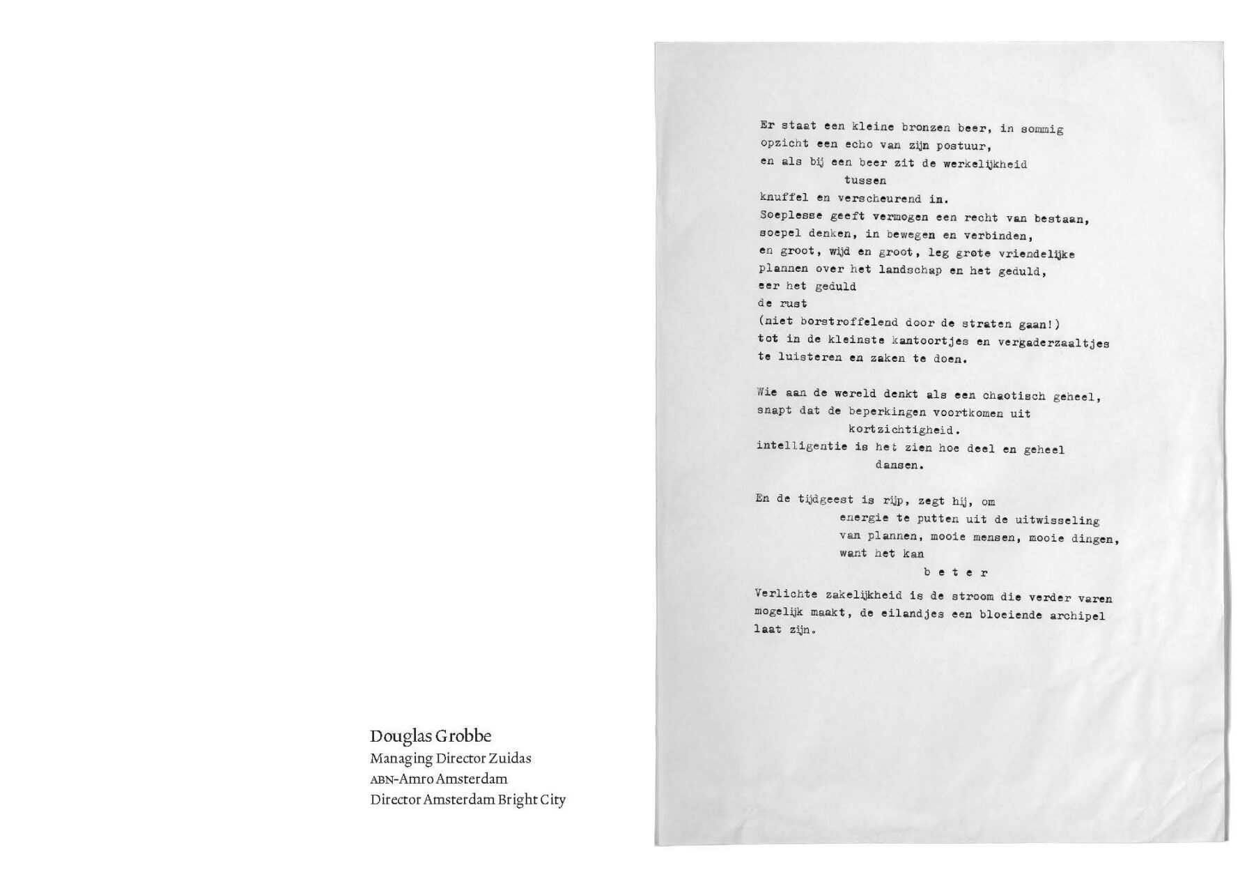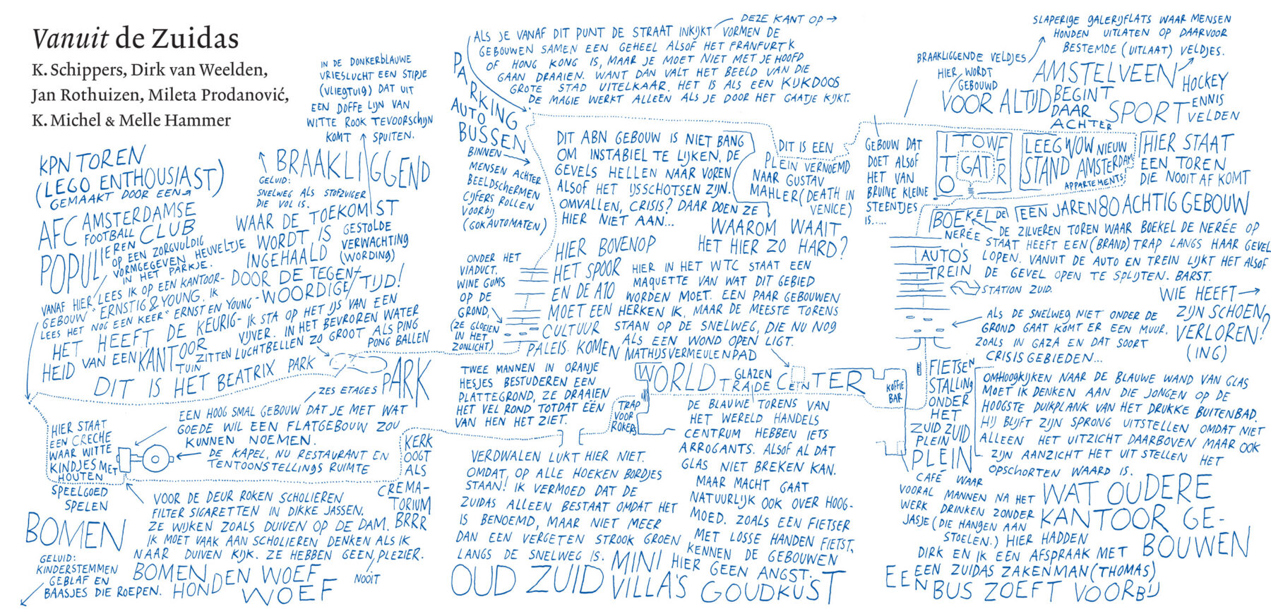 Vijf schrijvers/kunstenaars reageren op de ontwikkeling van de Amsterdamse Zuidas. Vanuit het voormalige Sint Nicolaasklooster aan de rand van het Beatrixpark hebben zij de Zuidas verkend om er hun bevindingen en gedachten over op te tekenen. Ieder verhaal is een persoonlijke zoektocht naar dit nieuwe deel van de stad. Vanuit de Zuidas vertelt over de herinneringen, dromen, daden, angsten en moed van mensen, in het bijzonder van hen die de nieuwe stad bevolken en er leven aan geven.