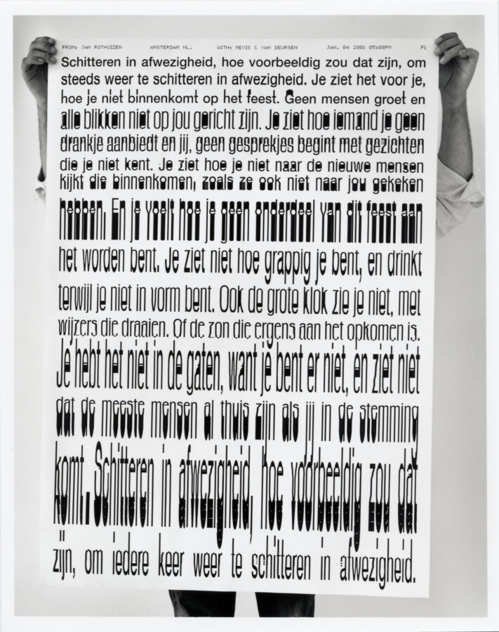 Text about the longing to stand out in absence, designed as a distorted fax message by Armand Mevis Mevis en van Deursen
